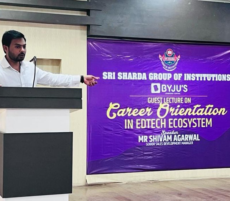 “Technology will not replace great teachers but technology in the hands on great teachers will be transformational.”-George Couros. Guest Lecture is a regular part of the curriculum in Sri Sharda Group of Institutions. We organized a guest lecture on the topic “Career orientation in Ed-tech ecosystem”. The lecture was delivered by Mr Shivam Agarwal (Senior Sales Development Manager, BYJUS). Mr Shivam highlighted the importance of technology in the field of education and gave our students some valuable insights on education as a career option.